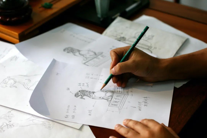 顾老师历时大半年,多次到故宫进行实物对比考察,以太和殿明清脊兽为原型,根据制炉工艺、出烟效果、空气流通原理等,进行创作设计,反复修改,绘制出瑞兽香炉雏形。