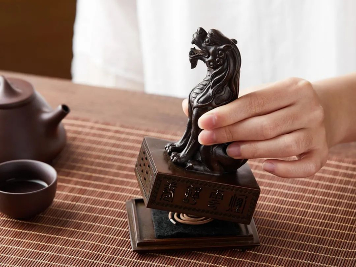 燃香后,将瑞兽香炉盖在底座上即可。