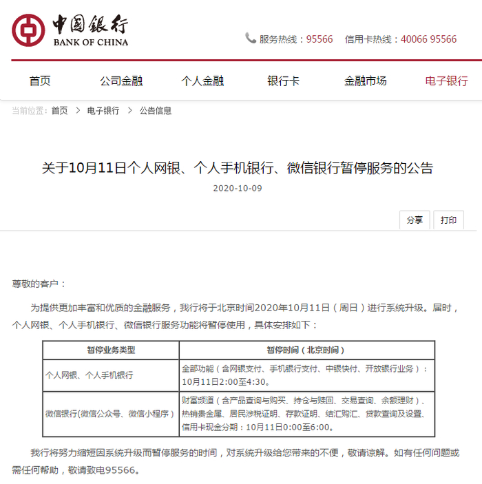 中国银行发布通知!10月11日个人网银、个人手机银行、微信银行暂停服务