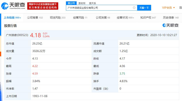 值得注意的是,截至10月9日收盘,广州浪奇报收4.18元/股。天眼查APP显示,最新总市值仅26.23亿。不少股民表示“老牌企业不厚道”。