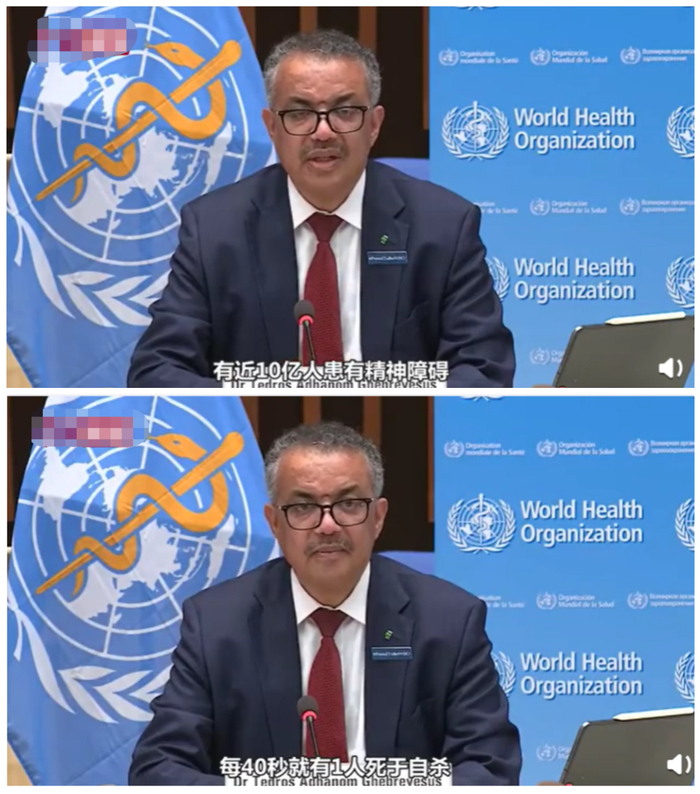 世卫组织总干事谭德塞表示,全球有近10亿人患有精神障碍,每40秒就有1人死于自杀。