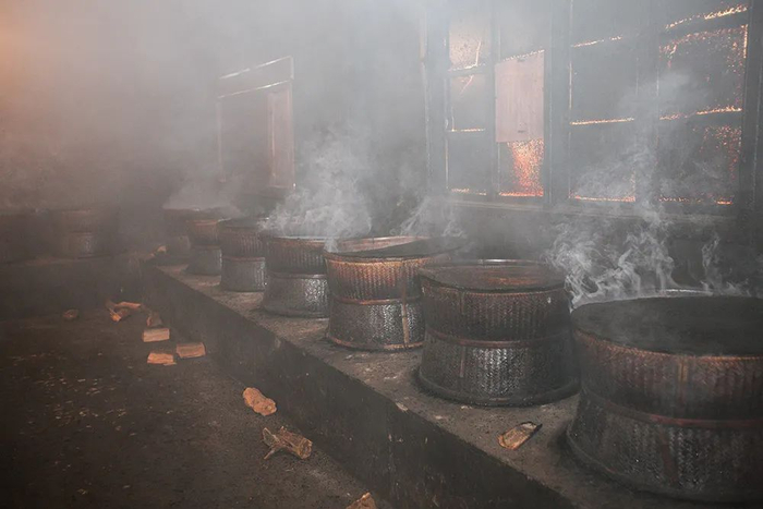 这一烧就是十几个小时,做茶师傅在一旁候着,随时观察火候和茶叶状态,烟熏火燎的环境,经常被熏得泪流不止。
