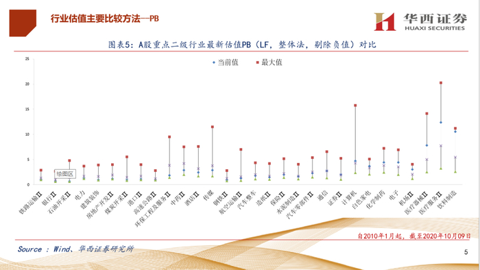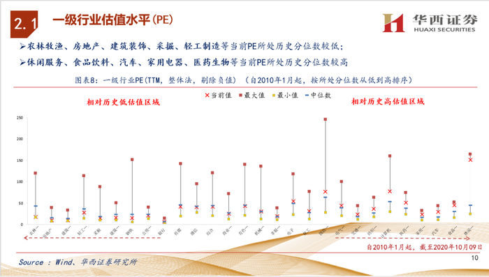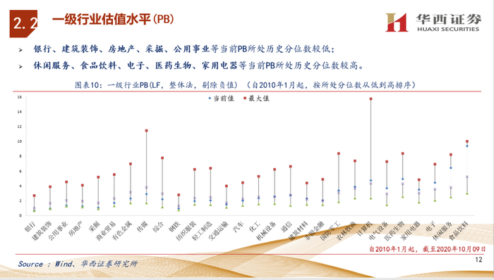 行业指数中估值水平(以2010年以来PB计算)位于较高分位的有食品饮料、休闲服务、电子、家用电器、医药生物;估值水平位于较低分位的有银行、建筑装饰、公用事业、房地产、采掘;二级行业中,以PB计算估值水平位于较高分位的有饮料制造、医疗服务、医疗器械、机场、电子;估值水平位于较低分位的有铁路运输、银行、石油开采、电力、建筑装饰等。