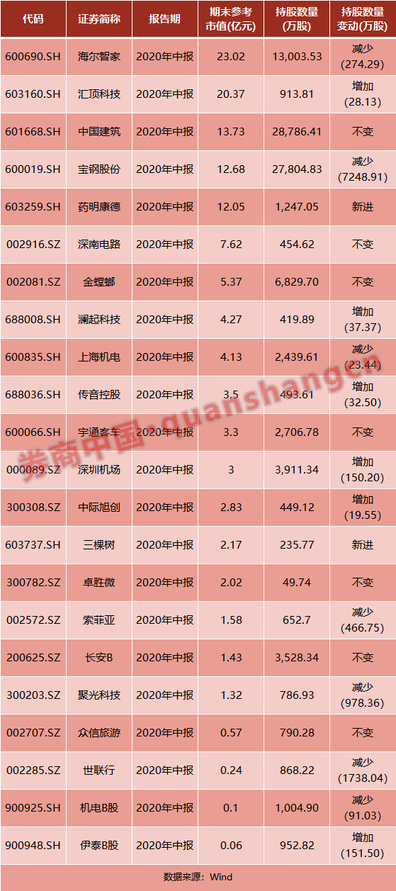 GICPRIVATELIMITED(新加坡政府投资有限公司)是投资A股规模最大的海外主权基金。在最新报告期2020年中报共出现在22只A股股票的十大股东之中,期末参考市值合计为125.35亿元。有5家公司的持股市值超过10亿元,分别是海尔智家(23.02亿元)、汇顶科技(20.37亿元)、中国建筑(13.73亿元)、宝钢股份(12.68亿元)和药明康德(12.05亿元)。