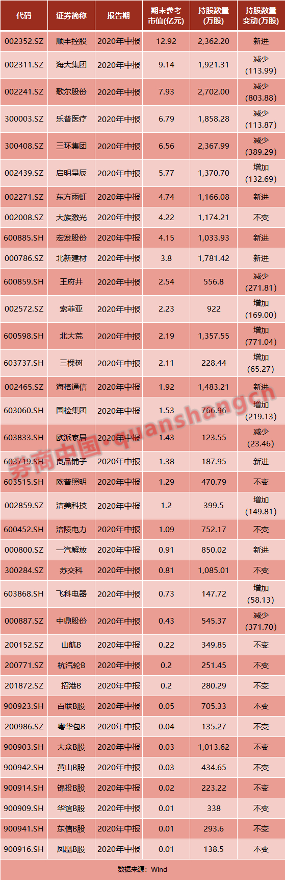 该基金在中国已获得了QFII身份,以挪威中央银行(NORGES BANK)的名义投资。在最新报告期2020年中报挪威中央银行共出现在37只A股股票的十大股东之中,期末参考市值合计为91.47亿元。持股最大的三只A股为顺丰控股、海大集团和歌尔股份,期末市值分别为12.92亿元、9.14亿元和7.93亿元。