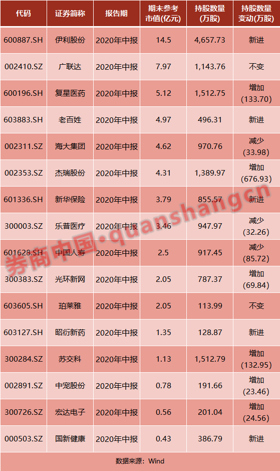 阿布达比投资局是阿联酋主权基金,根据上市公司2020年中报,阿布达比投资局共出现在16只A股股票的十大股东之中,期末参考市值合计为59.59亿元。持股最大的三只A股为伊利股份、广联达和复星医药,持股市值分别为14.5亿元、7.97亿元和5.12亿元。