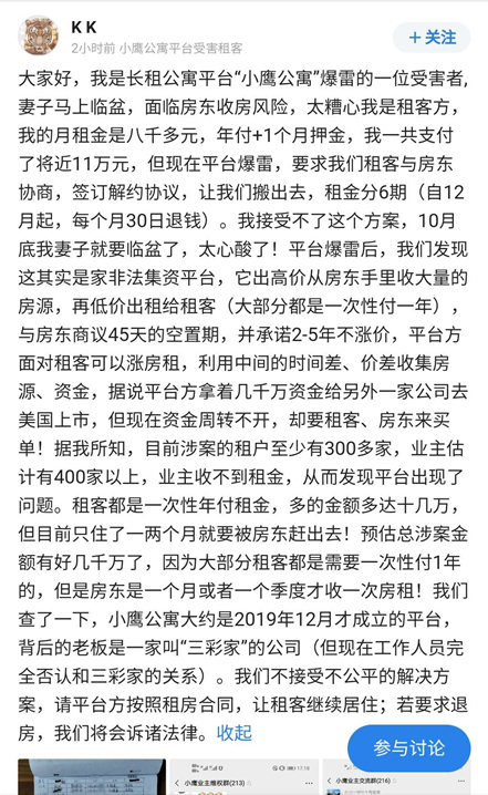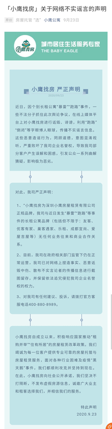 9月23日,小鹰公寓的官方微信发布了一则声明,表示公司仍在正常运营。而根据10月10日的现场统计信息,小鹰找房拖欠租金的业主已有300余名。
