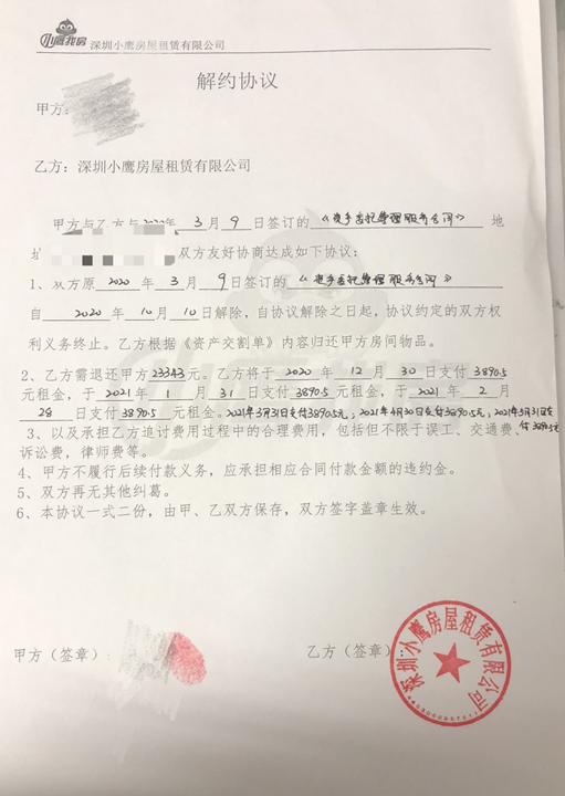 现场的社区工作人员表示,深圳市住建局、人力资源和社会保障局、公安局等有关部门已经介入调查,并组织房东和租户分别填写相关信息。而小鹰找房方面,一位外联部工作人员称,房东和租户协商好,可以一起到公司解约,公司拖欠房东和租客的钱将分6期返还,第一期将于12月30日退还,目前已有部分房东和租客签署解约协议。