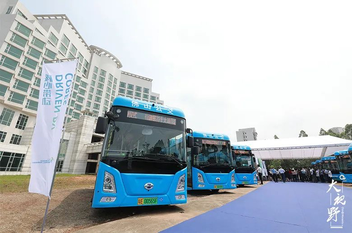 |仙湖氢谷十大项目启动暨佛山仙湖实验室工程建设启动仪式。现场氢燃料电池公交车进行展示。(珠江时报供图)