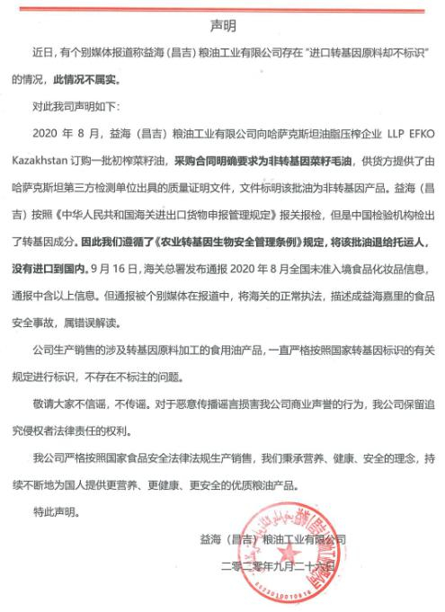 2020年9月26日,益海嘉里紧急辟谣,否认益海嘉里存在“进口转基因原料却不标识”的情况,称与供货方采购合同明确要求为非转基因菜籽毛油,但供货方提供了由哈萨克斯坦第三方检测单位出具的质量证明文件,文件标明该批油为非转基因产品。但是中国检验机构却检出了转基因成分,因此该批油已退回给托运人,没有进口到国内。