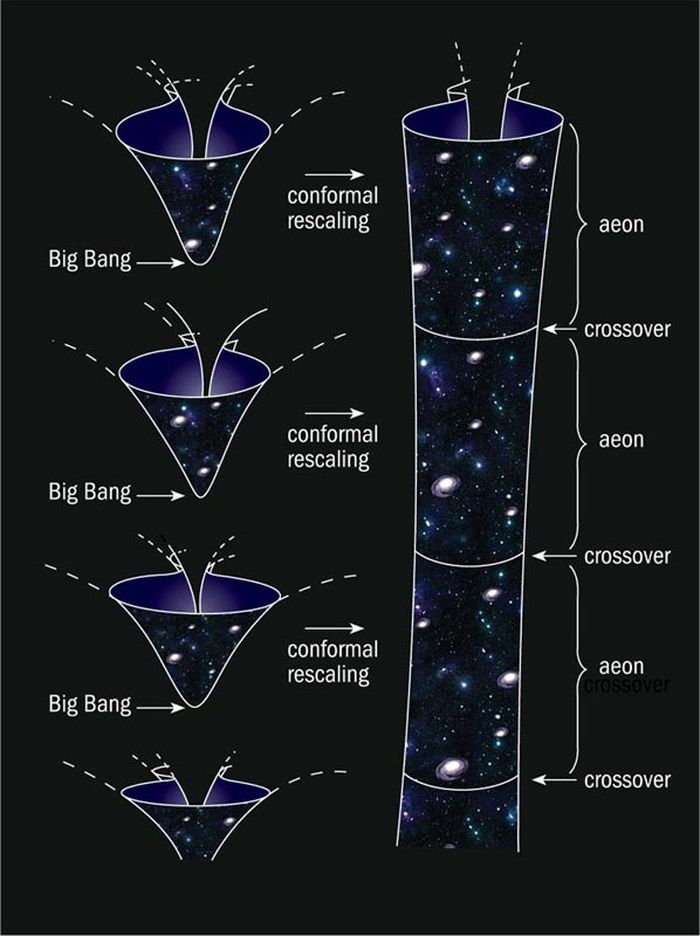 他将这个理论称之为“共形循环宇宙学”(Conformal Cyclic Cosmology,简称CCC),从大爆炸开始的宇宙终结于一个加速膨胀的时空,形成一个世代;每个世代的终结是下一个世代的大爆炸的开始……换句话说,CCC描绘了一个无限的宇宙循环。