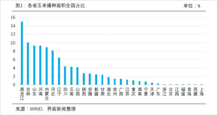 东北地区是我国最大的玉米产区。界面新闻梳理了国家统计局公布的各省市自治区玉米播种面积后发现,2007年以来,黑、吉、蒙、辽玉米播种面积在全国的占比不断上升,仅在2016年出现短暂回调,目前,四省区在全国的比重已经超过了40%。其中,作为全国最大的玉米种植省份,黑龙江在全国播种面积的占比达15%;吉林、内蒙古和辽宁的占比依次为10%、8.9%和6.4%。
