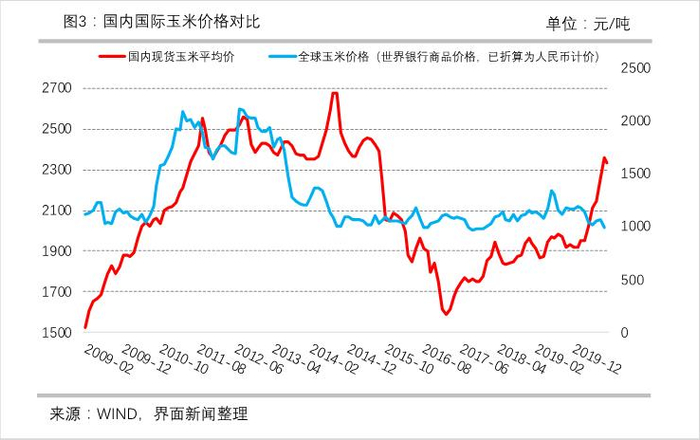 对比我国玉米现货均价与世界银行商品玉米价格,可以发现,2014年以来,我国玉米价格波动幅度远超相对平稳的国际玉米价格。