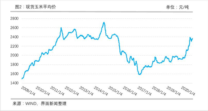 玉米价格的上涨态势已持续4年,并在2020年3月下旬以来加速。截至2020年10月10日,现货玉米均价2396.98元/吨,与2017年2月的底部相比,玉米每吨价格上涨超过800元,涨幅达51%;与2019年末相比,上涨450元,涨幅25%。