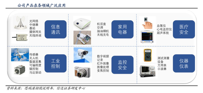 思瑞浦成立于2012年,是一家专注于模拟集成电路产品研发和销售的集成电路设计企业。公司主营高性能模拟芯片,分为信号链模拟芯片和电源管理模拟芯片两大类,以信号链模拟芯片为主,并逐渐向电源管理模拟芯片拓展。目前已拥有超过900款可供销售的产品型号,应用范围涵盖信息通讯、工业控制、监控安全、医疗健康、仪器仪表和家用电器等众多领域。