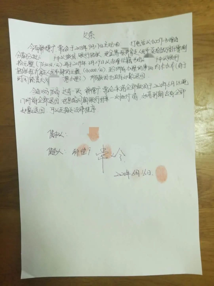 郗德广、常岭二人在2020年6月写给张雪(化名)的欠条,明确写明了他们以“办工作”“办学籍”收受了张雪80余万,并约定了退还款项时间。受访者供图