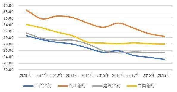 究其原因,在于其过高的费用支出。《红周刊》统计的结果显示,农业银行一直有着较高的费用开支比率,这侵蚀了其经营利润。以2019年为例,农业银行管理费用占营收的比重达30.49%,超过建设银行约5个百分点,超过工商银行7.21个百分点。