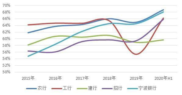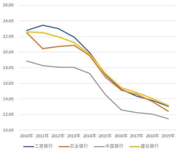 员工年龄偏大,导致活力不足,效率低下,影响一家商业银行的长远竞争优势方面,这在农业银行身上也有体现。以中收业务来说,农业银行非息收入占比远低于四大行。农行非息收入占比2019年仅为22.38%,这低于其他3家国有银行30%上下的水平。