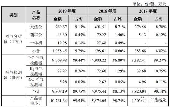 不过,某医药行业分析师表示,虽然在售的产品种类较多,但具备规模化生产销售的产品还是以呼气NO检测设备产品为主,从上表可以看出,呼气NO检测设备产品是公司收入和利润的主要来源。报告期内,占主营业务收入比例分别为 90.14%、88.13%和 89.75%,其中纳库仑一氧化氮检测器收入占主营业务收入比例分别为 89.27%、86.80%和 89.44%。