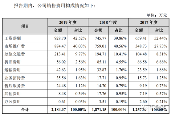 尚沃医疗属于新兴IVD领域的POCT细分子行业,或许正是由于检测的快速且便携性,2017年-2019年,伴随着销售规模的不断扩大,尚沃医疗的销售费用呈现逐年增长。通过下表可以看出,销售费用主要为工资薪酬、市场推广费和差旅交通费,报告期内三项费用合计占销售费用的比例分别为88.48%、90.83%和 92.32%。