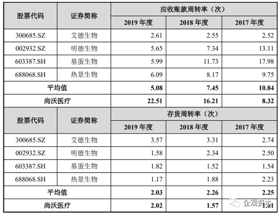 从上表可以看出,2017年公司应收账款周转率低于同行业可比公司平均值,对此,尚沃医疗给出的解释是,由于公司2017年期初应收账款余额较高;2018年之后公司应收账款周转率高于同行业可比公司,主要由于公司产品认可度不断提升,主要采取先款后货的销售模式所致。此外,报告期内,存货周转率分别为 1.61次、1.57次和2.02次,2018 年公司存货周转率有所下降主要由于2018年公司进行新产品备货,存货余额增加所致。