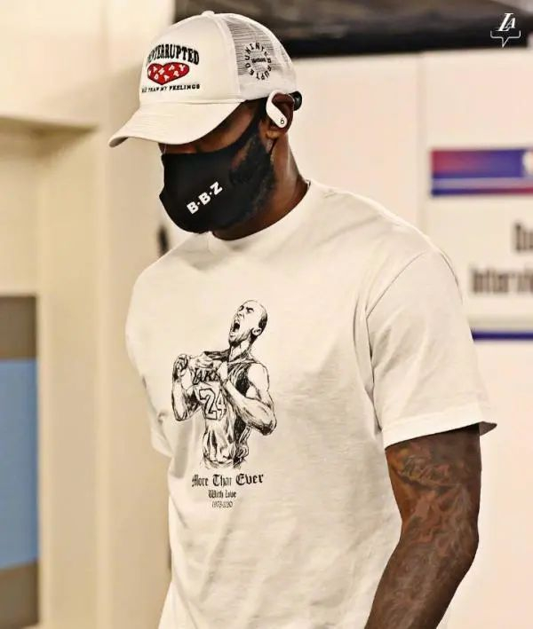 詹姆斯身着印有科比图像的T恤。