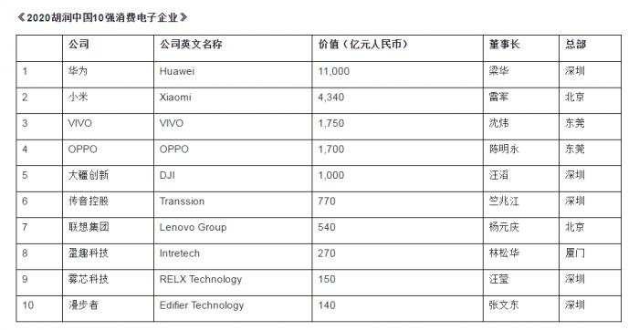 10月12日,胡润研究院发布《2020胡润中国10强消费电子企业》(Hurun China Top 10 Most Valuable Consumer Electronics Companies 2020),这是胡润研究院首次发布该榜单,调研范围仅包括中国大陆民营企业。