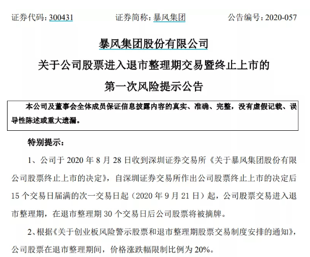 今年9月21日起,暴风集团进入退市整理期,在退市整理期30个交易日后公司股票将被摘牌。股票简称更改为“暴风退”。