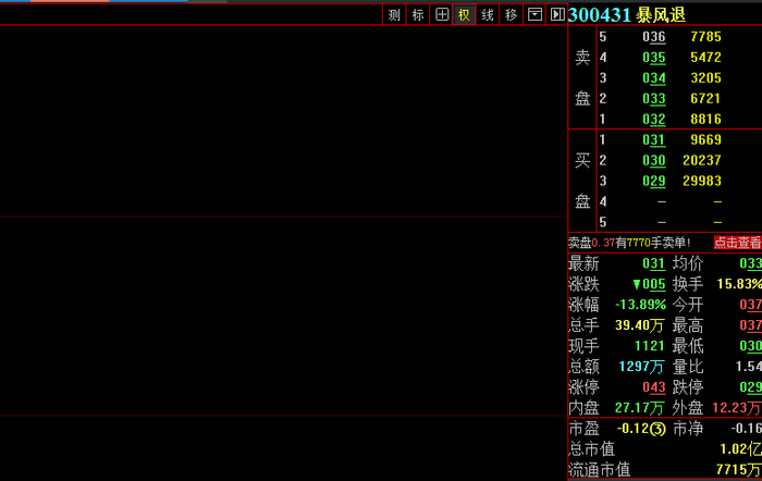 而进入退市整理期之后,暴风集团的股价更是连续6个20%跌停,最新数据显示,暴风退10月9日跌13.89%,股价跌至0.31元,总市值仅剩1亿元,据退市前的4.88亿市值,继续跌了80%;据最高市值408亿元,下跌了99.7%。