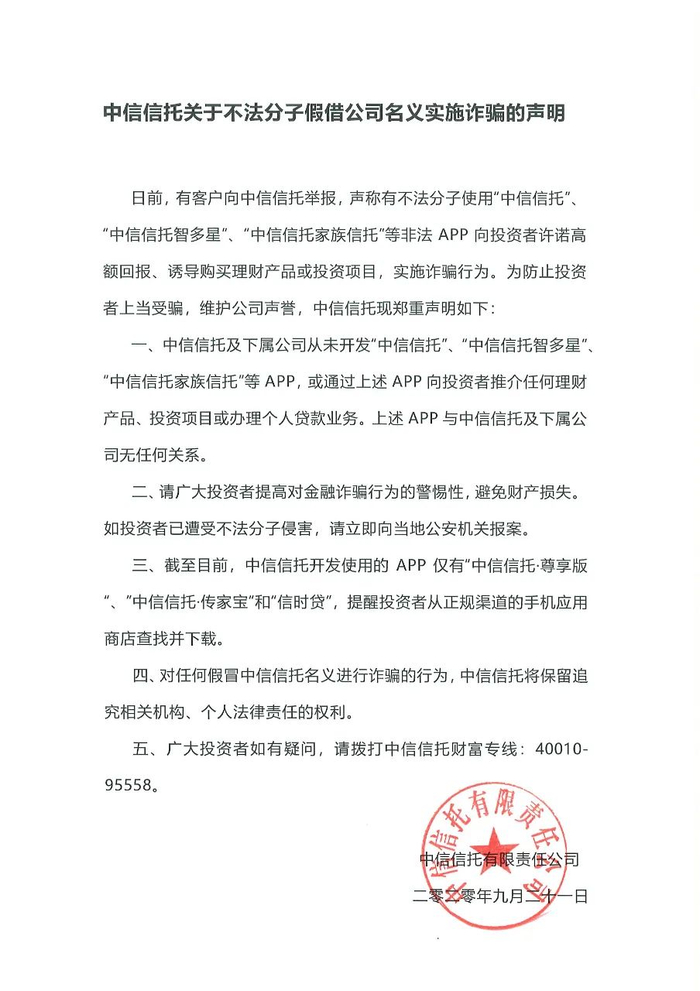 一、中信信托及下属公司从未开发“中信信托”、“中信信托智多星”、“中信信托家族信托”等APP,或通过上述APP向投资者推介任何理财产品、投资项目或办理个人贷款业务。上述APP与中信信托及下属公司无任何关系。