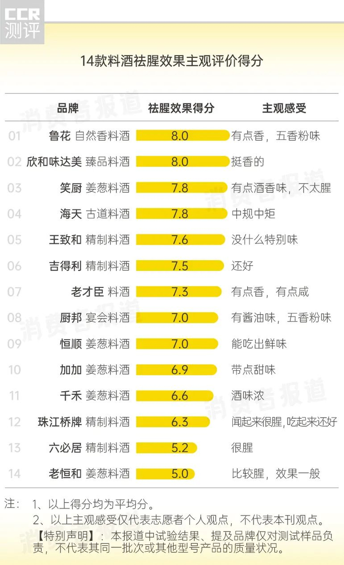 笑厨、海天、王致和、吉得利、老才臣、厨邦、恒顺、加加、千禾、珠江桥等10款料酒的得分在6.3~7.8之间,属于“腥味稍多”的级别。