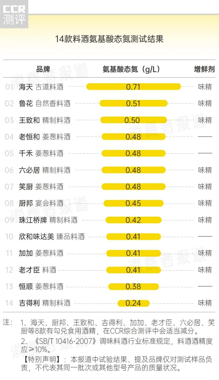 14款料酒测试:海天、鲁花等10款有勾兑味精,老恒和、六必居祛腥效果一般