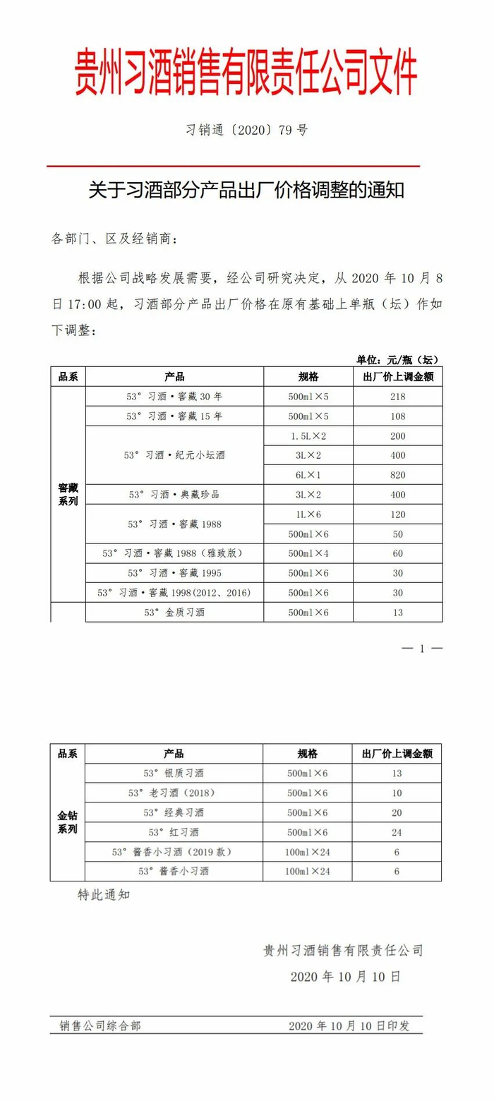 10月10日,习酒方面发布《关于习酒部分产品出厂价格调整的通知》,标志着习酒提价的“靴子”正式落地。