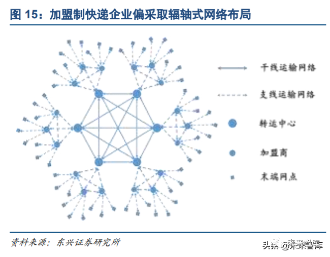 现阶段,各家快递企业都采取辐轴式的网络布局方式:以转运中心为核心物流节点,核心物流节点间以干线 运输相连接;核心物流节点以支线物流网络连接到各加盟商以及更末端的终端网点。由于快递公司都需要对 国土进行全面网络覆盖,可以想象各家快递公司的配送网络之间会存在较大的重合。这也就意味着,任何一家快递公司在全国任何一个区域都面临着其他所有主流快递公司的竞争压力。行业的竞争(在国内)是不存 在地理区位限制的。