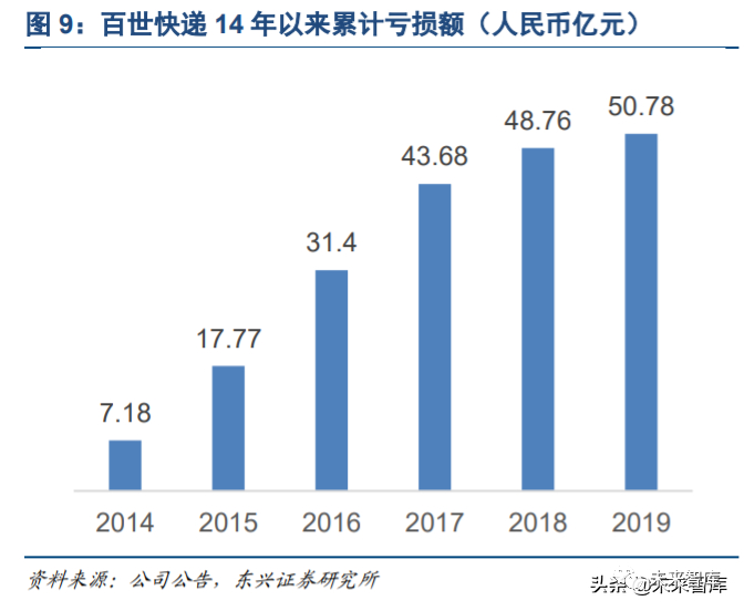 这些资金在百世对其他老牌快递企业的追赶过程中起到了非常关键的作用。从 2014 年算起,百世快递连年 亏损累计亏损额超过 50 亿元,其中 14-17 年是亏损最为严重的几个年份,每年亏损额在 10 亿元以上。若缺 乏资本市场持续的资金支持,这一追赶过程基本不可能实现。然而,即使已经在市场份额方面逐步赶上,百 世的市值依旧与行业龙头的中通有巨大的差距。