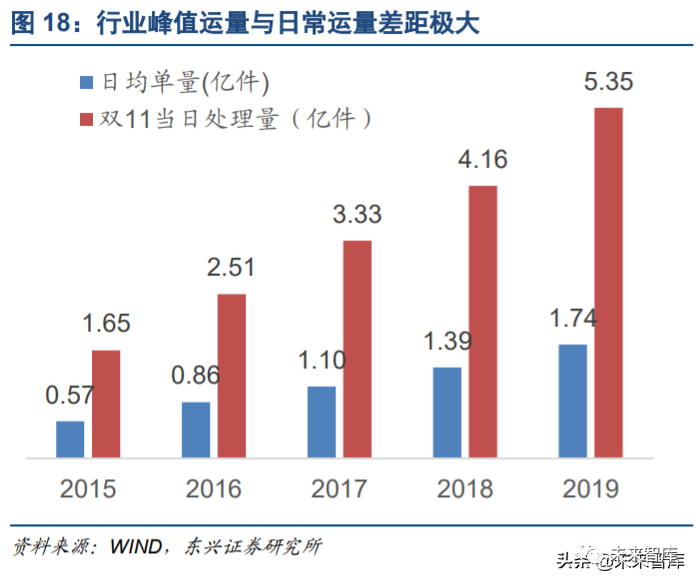 根据以往的经验,双 11 当日快递投送量与正常时段的日均快递投送量差距极大,一般会达到正常时期的三 倍左右,如 19 年日均快递投送 1.74 亿件,而双 11 当日高达 5.36 亿件。