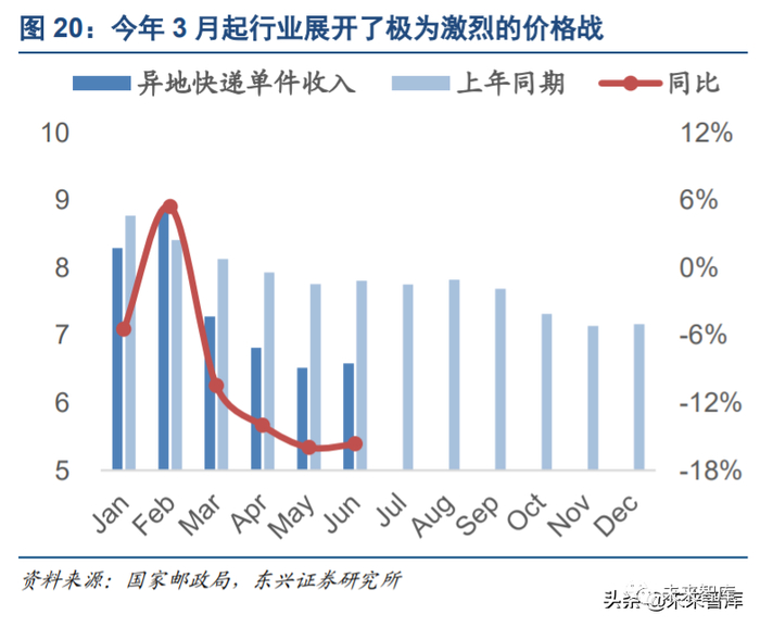 回到我们的观点,价格战的烈度与其要达到的战略目的直接挂钩:今年由于疫情影响,所有公司除了顺丰, 从 3 月开始都是一个关机重启的状态。经历了一个多月的服务断档,整个电商件市场面临一个地盘重新划分 的危机;快递行业本身较大产能的冗余更是加剧了市场的混乱状态。在客户关系恢复到一个相对稳定的状态 前,各企业必须要拼尽全力维护自己的客户资源,否则很容易面临市场份额下滑的危机。这才是今年价格战 在 3 月到 5 月间愈演愈烈的主要原因。而随着客户关系的恢复,市场逐渐恢复稳定,价格战在 6 月开始降温。