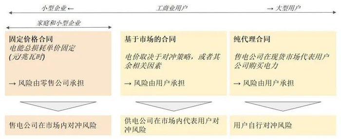 一般来说,居民用户和小型企业往往依赖于固定价格合同,而工商业用户的选择余地则更大。也存在一种“混合型合同”,其结构方式售电公司和用户共同承担风险:用户购电首先以市场为基础的方式进行,但随着交付日期的临近,用户在现有的基础上转换为固定价格合同,售电公司负责在期货市场和现货市场调剂负荷余量。