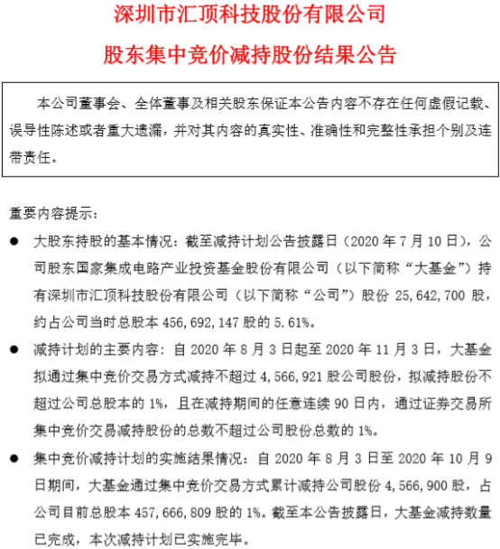 汇顶科技10月12日晚公告,国家集成电路产业投资基金(简称:大基金)8月3日至10月9日累计减持1%的公司股份,合计约456万股。截至公告披露日,大基金减持数量已完成,此次减持计划已实施完毕。按汇顶科技8月3日至10月9日期间的均价计算,大基金此次通过减持,套现约9亿元。