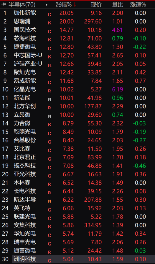 就在汇顶科技公告大基金年内减持完毕之际,当日A股市场半导体概念再掀风云,芯片板块以4.59%的涨幅领涨A股。截至收盘,科创板思瑞浦大涨20%,国民技术、沪硅产业、派瑞股份、芯海科技、中芯国际等跟涨,涨幅皆超12%。北方华创,新洁能,立昂微等涨10%。
