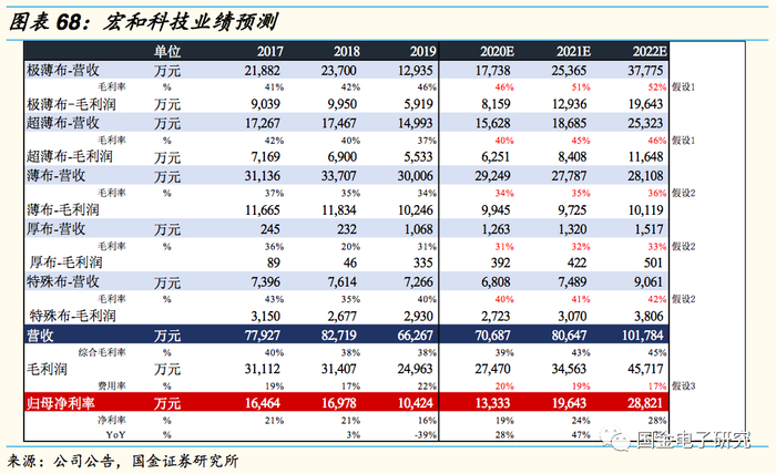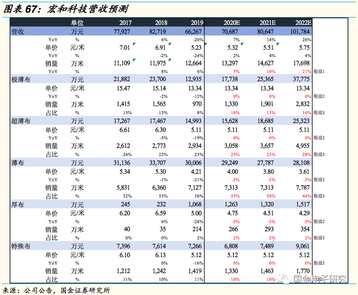 1) 假设1:公司布局上游电子纱主要针对超薄/极薄布用,未来将显著贡献公司高端产品毛利润,我们保守估计超薄/极薄布的毛利率在20年恢复至正常水平、21年相对20年提升5个百分点、22年相对21年提升1个百分点,则有2020~2022年极薄布、超薄布毛利率分别为46%/51%/52%、40%/45%/46%;