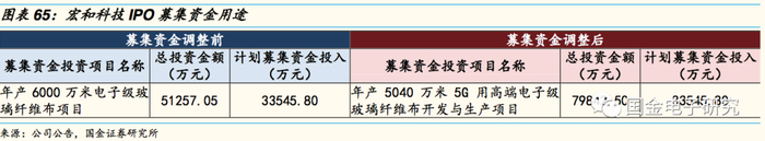 ◾ 定位中高端,IPO项目计划于2022年投产。公司成立于1998年,是一家专注于薄/超薄/极薄型电子布的台系企业,公司营收中有43%来自于超薄/极薄布,且逐渐向特殊材料电子布(高频高速/封装基板用)布局,因此公司中高端定位确立。公司2019年上市,IPO募集资金原用于“年产6000万米电子级玻璃纤维布项目”,后经调整用于“年产5040万米5G用高端电子级玻璃纤维布开发与生产项目”,预计于2021年投建、2022年投产。