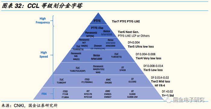 5G信号频段提高且传输响应速度加快,使得物理基础设施(如基站、光传输设备、路由器、交换机)等产品中用作线路传输的CCL/PCB板的规格有所提升,以5G基站AAU的射频板为例,以往在4G时代主要用PTFE类高频CCL产品,而在5G时代主要用碳氢类高频CCL产品,且高频材料使用面积相较4G时代提升了1倍多;服务器由于芯片平台更新换代导致总线标准升级,服务器主板用的高速PCB层数和CCL材料都要相应升级,也就对应高速板的用量增加和高速CCL的规格升级。