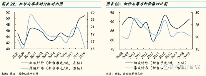 从电子布的营业成本拆解情况来看,原材料成本是电子布中主要耗用部分,而原材料中有 90%的成本来自于电子纱,可以说电子纱的价格显著影响了电子布的价格。在这样的产业关系下,电子布也因电子纱的周期性而呈现周期性。从德宏工业的数据可以大致看到,电子纱和电子布之间的价格存在相关性,周期波动性趋同(德宏在 2019 年自身经营出现问题所以造成电子纱和电子布的价格背离)。
