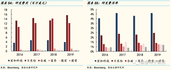 1) 技术接近日企,研发费用领先超越可期。从技术的前沿性上来讲,日企的技术能力是更加具有前瞻性的,包括2019~2020年爆发的5G高频材料中需要使用的NE玻纤制成的NE电子布也是日东纺在90年代就开发出来的产品,薄系列产品日东纺也做到了1010的极薄水平。虽然日企技术较领先,但从商业的角度上来看公司与之差距并不是很大,因为日企研发出前沿产品和需求整体爆发之间具有较长的时间差(如NE玻纤90年代问世到需求爆发之间相隔近30年),这一时间差也给其他竞争对手赶超的机会,从布局上来看,公司薄系列产品已经布局到1017的水平(1010从今年开始小批量),并且也具备制备Low Dk/Df电子布的能力,技术水平是与日企相近的;相比其他台企来说,公司的产品布局也是更高端的,单价水平也相对较高,因此公司技术能力是相对领先的。