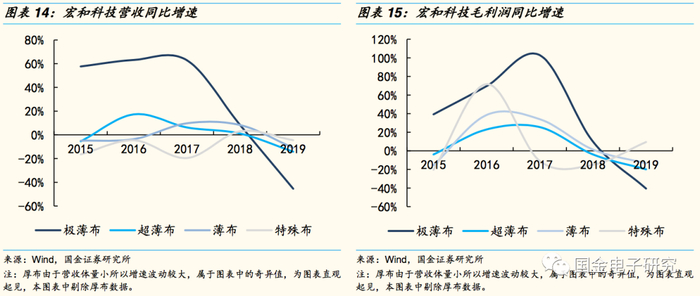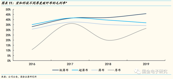 2)高端电子布价格稳定性强。高端电子布产能与中低端无法共用,且全球有技术能力的厂商不多,因此整体来说高端电子布价格相对稳定,其中包括极薄布和需要特殊配方的特殊材料电子布。从数据上来看,在贸易摩擦加剧、全球需求下滑的2019年,公司各类产品单价都有所下滑,但高端产品的单价降幅相对低端产品更窄,且高端电子纱/电子布厂商日东纺在2019年毛利率相对稳定,因此可见高端产品价格和盈利性更稳定。