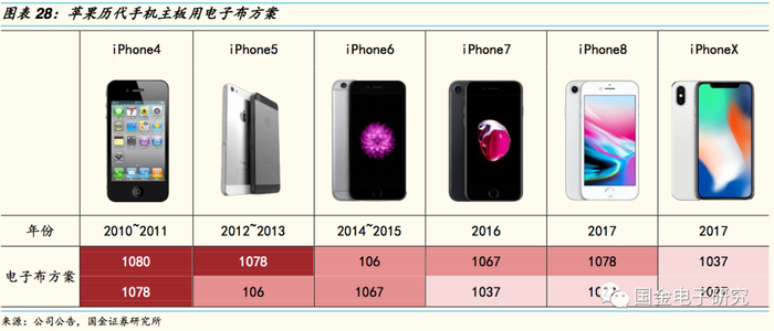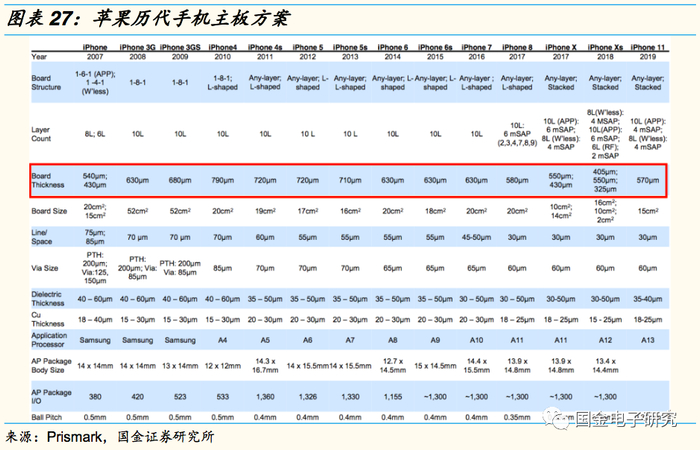 因智能手机对移动性、轻便性有要求,所以其主板对厚薄的敏感性是较大的, 从而也使得薄系列电子布主要应用在智能手机主板中。在日益看重外观革新趋势下,各大厂商在新机设计中都尽量维持手机主板厚度降低的变革趋势,相应的主板中所用电子布的规格也在持续升级,从苹果历代手机主板的厚度变化和电子布应用类型可以看到此趋势。