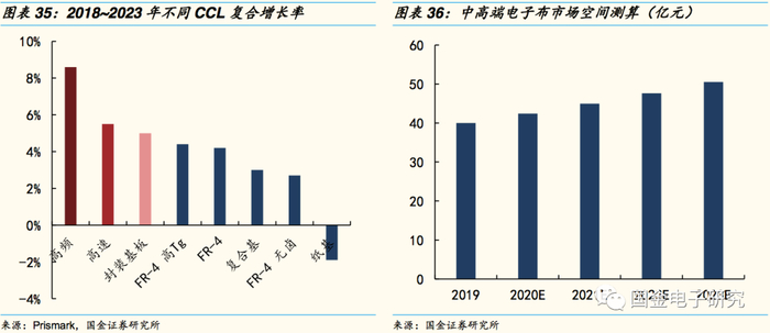 从量化的角度来看,公司对标的中高端市场未来增长主要来源于手机主板、5G、服务器等应用,而具体到CCL板材,主要瞄准高频、高速以及封装基板。根据Prirismark预测,未来高频、高速和封装基板是未来增长最快的三个板块,2018~2023年复合增速分别达到8.6%、5.5%和5%,我们保守估计按照6%的复合增速来计算中高端电子布市场空间,至2023年对公司的有效市场空间将达到50.5亿,而目前公司的中高端营收仅5.8亿元,可见公司在中高端市场仍然有较高的成长空间。