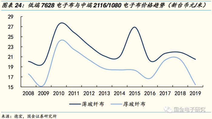 电子布由于上游是玻纤,而玻纤本身具有一定的周期性,因此价格的波动较大, 所以要判断未来市场的增长趋势,要分别从价和量两个维度来讨论。