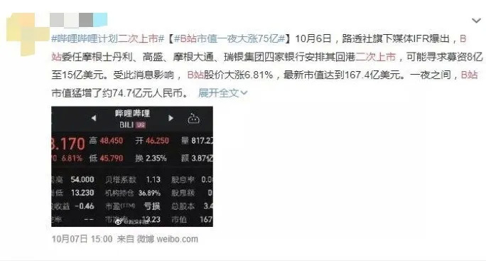 对于B站赴港二度上市的消息,公众并不十分意外。国庆假期期间,据路透社旗下媒体IFR报道,B站委任摩根士丹利、高盛、摩根大通、瑞银集团四家银行安排其回港二次上市,计划筹资8亿至15亿美元。B站官方尚未作出回应,但是舆论市场上已经将这件事盖棺定论。